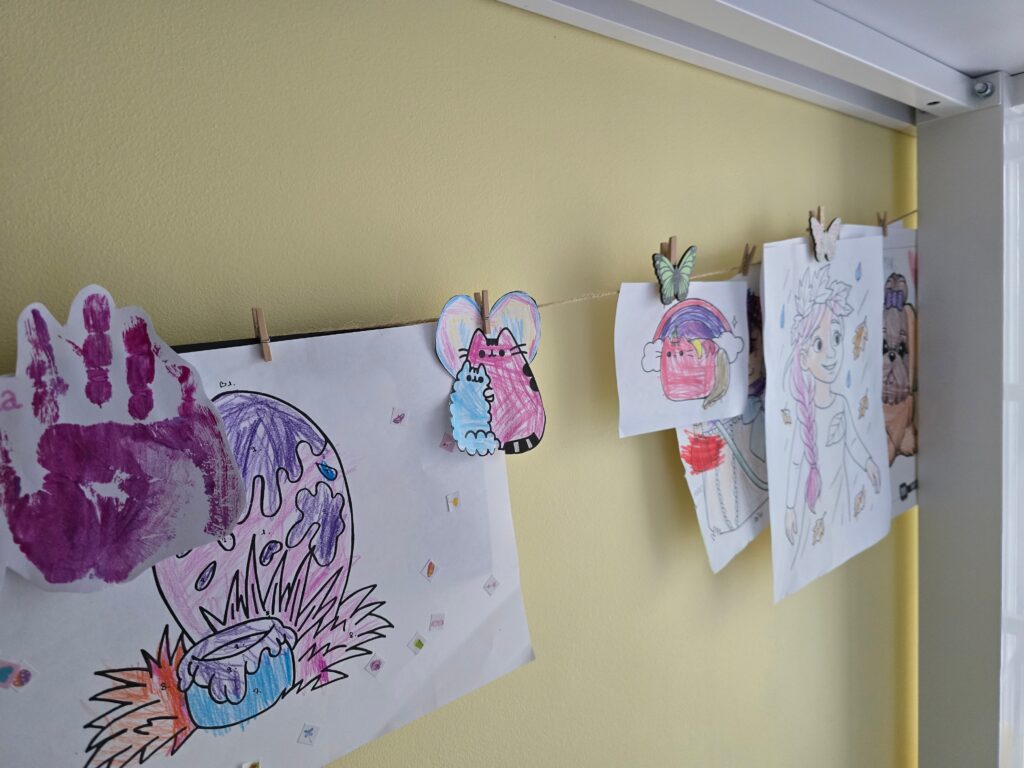 Sznurek i klamerki — prosty i dobry sposób na ekspozycję rysunków dzieci. Można zawiesić sznurek na ścianie, szafie czy między nogami łóżka piętrowego. Łatwo podmienić rysunki, są one dobrze widoczne. To taki miły gest, by eksponować to, co dzieci tworzą 😉 To dla nich bardzo ważne 💖
