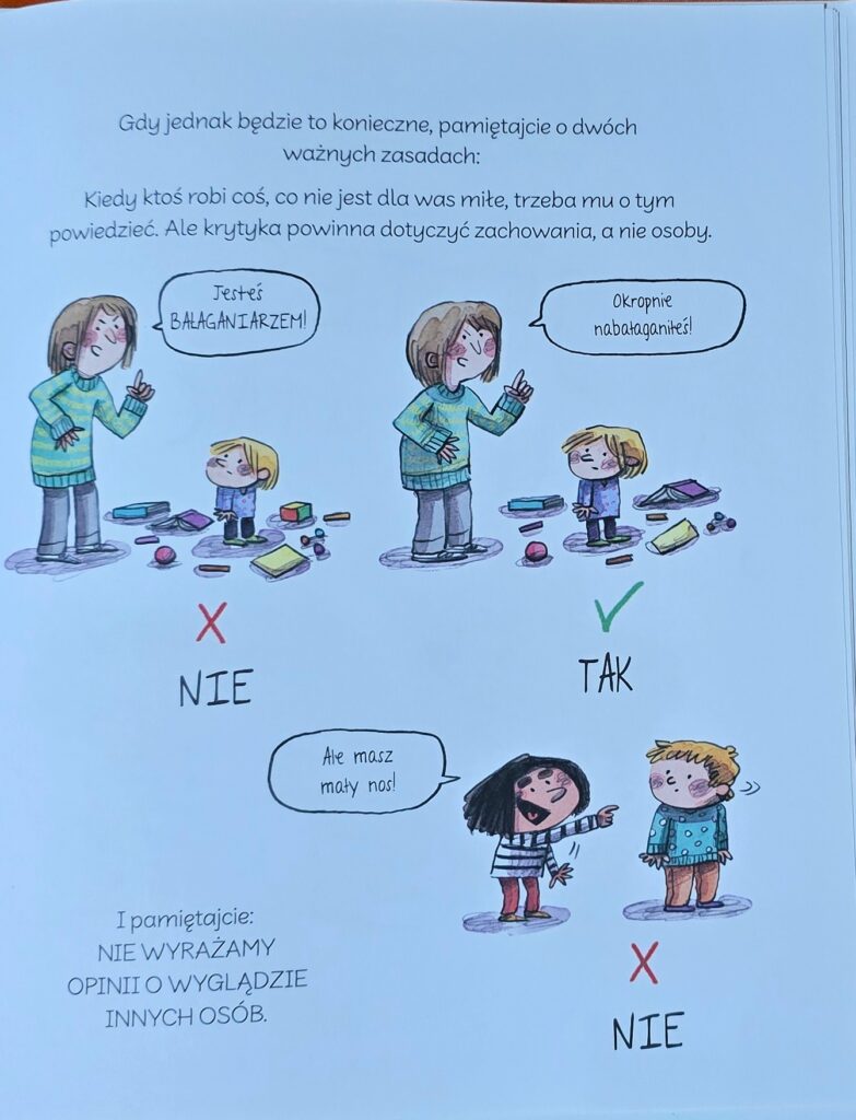 „Nie mów tak do mnie!" autorstwa Lucia Serrano to bardzo mądra i ciekawa książka, która tłumaczy, dlaczego lepiej mówić, że „ktoś się głupio zachował" niż „jest głupi". Albo że ktoś „potknął się i przewrócił", a nie „jest gapą". A że dzieciom trzeba to na okrągło przypominać, to taka lektura w domu bardzo się przyda 😉 Książka prostymi słowami i przykładami objaśnia, czym są etykietki i jak bardzo mogą utrudniać życie. Idealna na wspólne czytanie, bo i my doroślimy mamy w tej kwestii spore pole do rozwoju 😉 Polecam najbardziej na wiek 5-10 lat. I specjalnie daję dla zilustrowania zdjęcie jednej ze stron, a nie strony tytułowej.